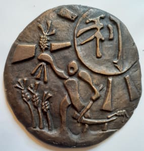 This ideogram meaning “profit”, broken down into its component parts means “grain” and “blade”. From this Ricci created an image of a farmer holding a sickle, ready to harvest the crops. Christian morals illustrated by this image could be described by the phrases “you reap what you sow “, and “what is it for a man to gain the whole world but lose his soul”. There is a moral choice to be made. I have chosen the figures of Jesus and Judas to illustrate the choice between good and evil in deciding how one decides to “reap the harvest of life”. A central stalk of wheat is being pulled down on one side by the figure of Judas who has committed suicide by hanging himself from it. From his hands spill those pieces of silver, the symbols of his betrayal. Judas is contrasted with the figure of Christ who is crucified upon a sickle, which in turn is attached to the stalk of wheat. In this image Christ is the farmer who has gathered the harvest to His own cost-but with no thought for Himself.